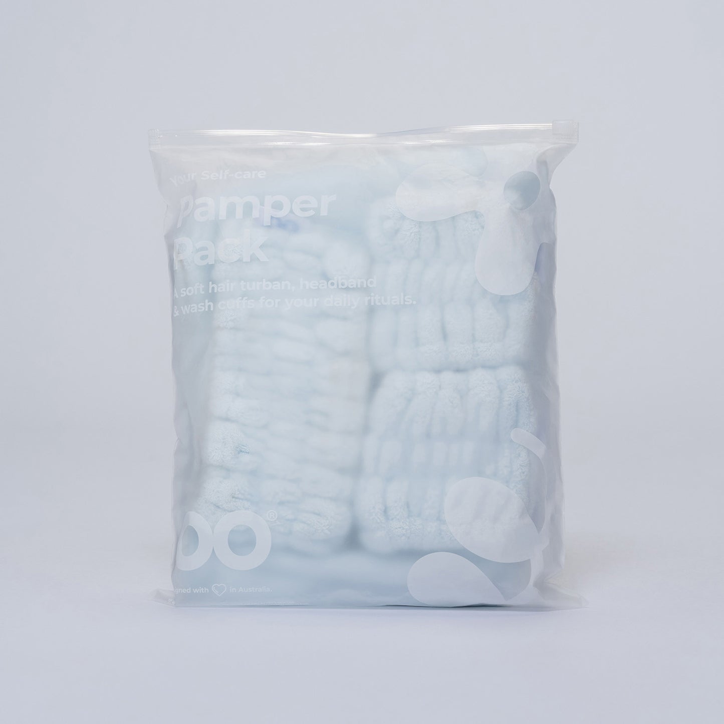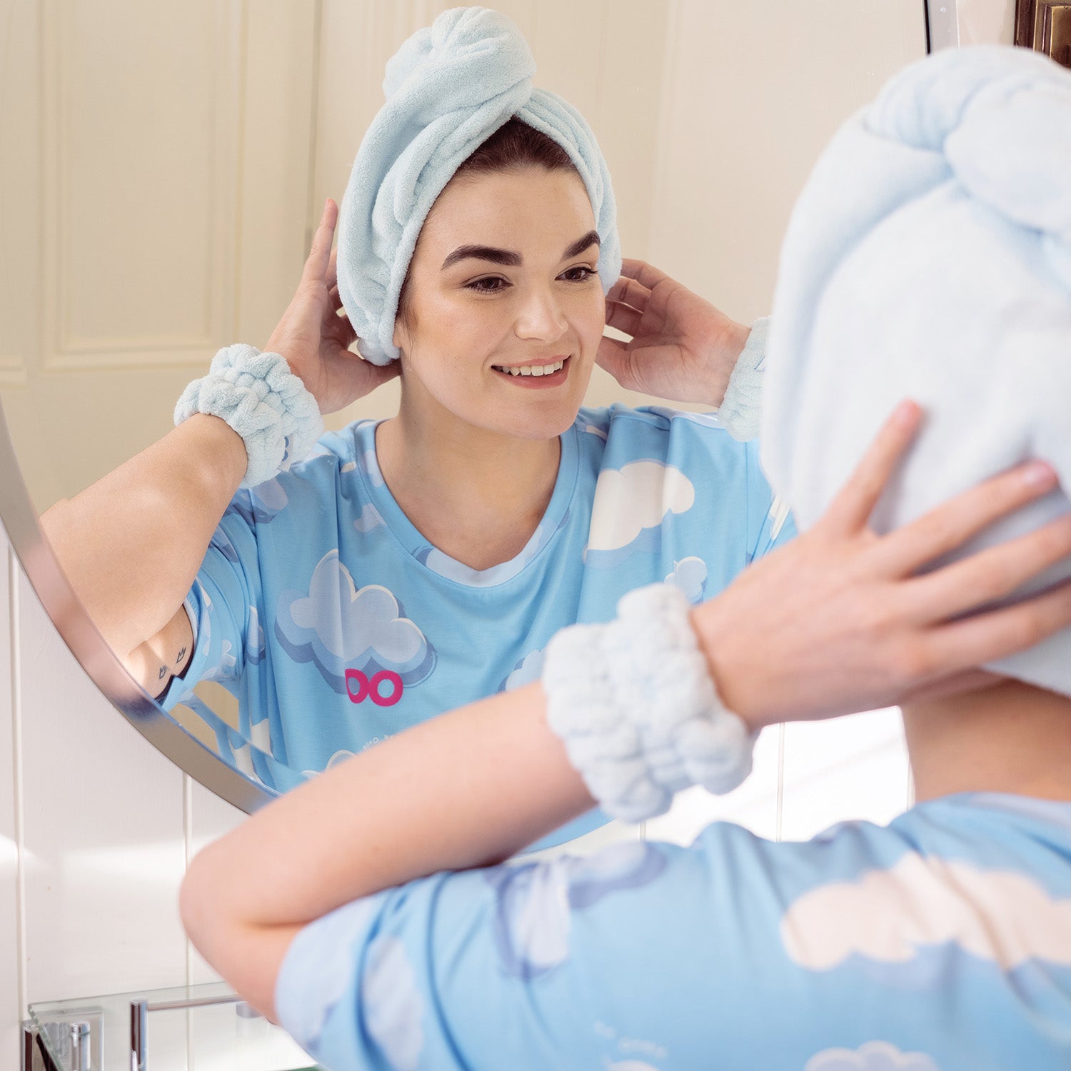 Use our Pamper Pack for your daily routine – from removing makeup to getting ready for the day. Slip on the wash cuffs to prevent liquid spills and keep sleeves dry, pop on the headband to tuck away flyaways, and twist up your hair in the turban for quick, cosy drying. No heavy towels, no fuss.